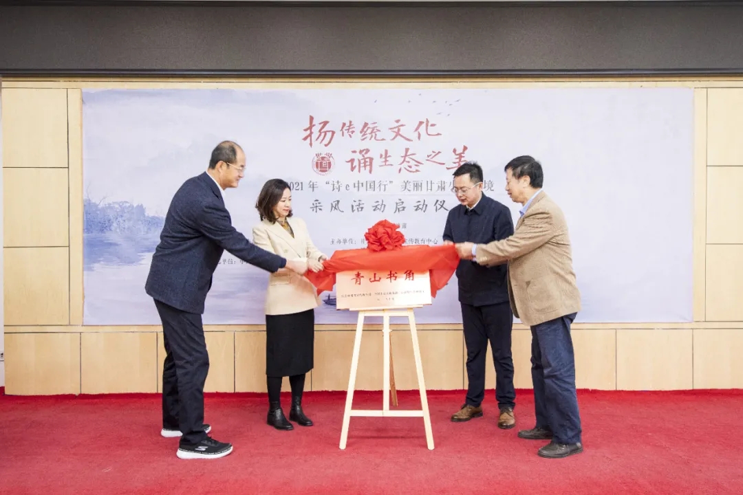 在“青山书角”揭牌仪式上,甘肃省嘉峪关市委常委、副市长徐金丽,中国环境出版集团总经理总编辑助理、环境保护杂志社社长、总编辑郭媛媛,甘肃省生态环境宣传教育中心主任胡晓明,中国生态文明研究与促进会监事长杨明森共同为“青山书角”安家落户嘉峪关揭牌,为美丽甘肃再添一缕书香。