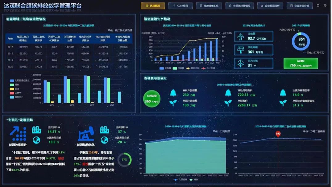 “碳排放数字管理平台上线后,将在线‘盯紧’当地重点用能企业,实现温室气体清单编制、碳排放数据报送、辅助碳核查等功能,督促引导达茂联合旗各用能企业以积少成多之力减少碳排放,服务和保障全旗实现碳达峰、碳中和目标,充分发挥试点旗县示范带动作用。”孟和巴特尔强调。