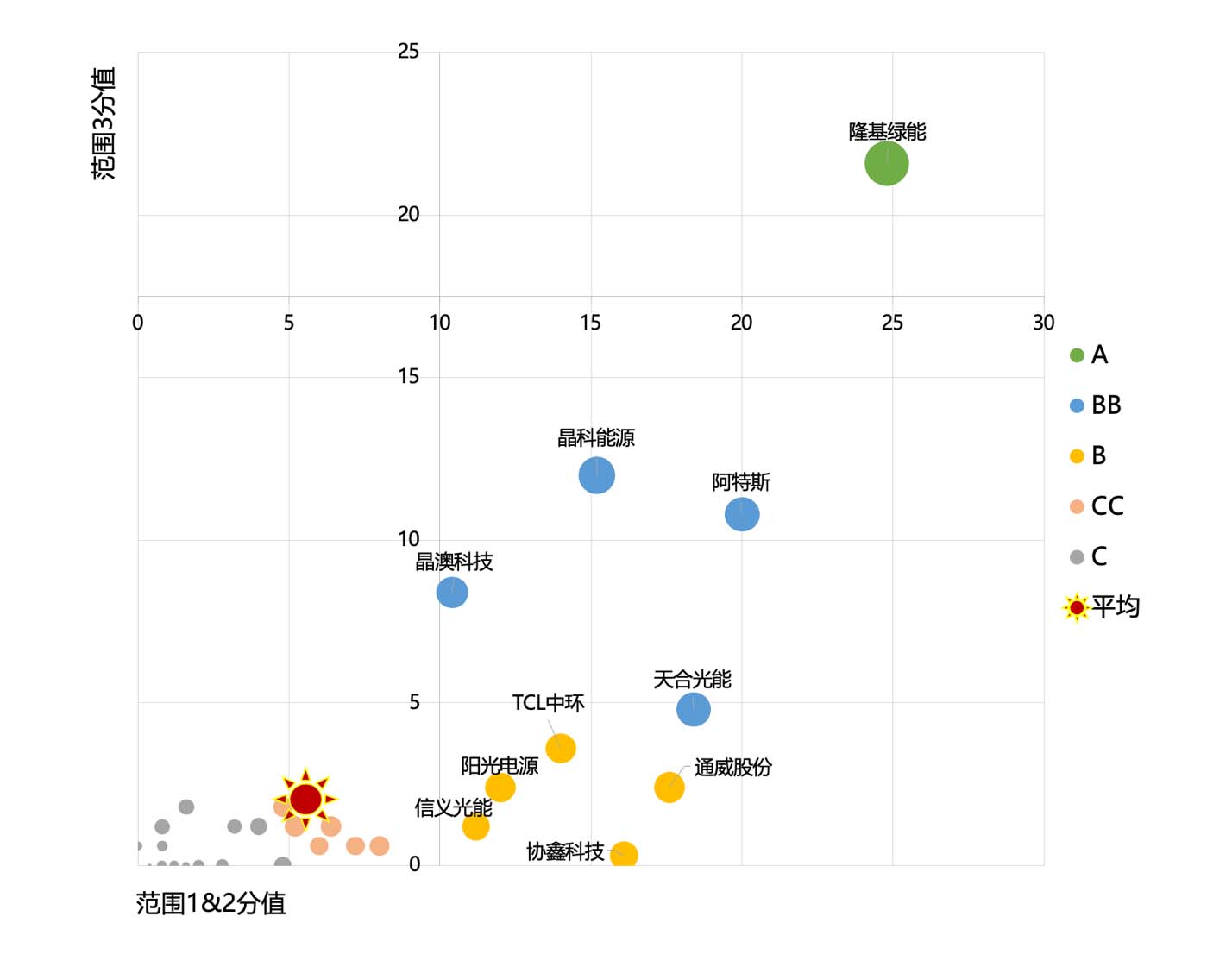 获评B级的通威股份(600438)、TCL中环(002129)、阳光电源(300274)、协鑫科技(03800)和信义光能(00968),在供应链低碳转型路径设计、供应商碳核算赋能等方面均有较好表现。